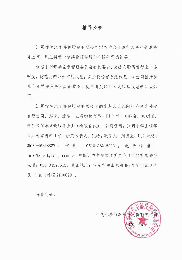 江陰標(biāo)榜汽車部件股份有限公司擬首次公開(kāi)發(fā)行人民幣普通股并上市,現(xiàn)正接受中信建投證券股份有限公司的輔導(dǎo)。