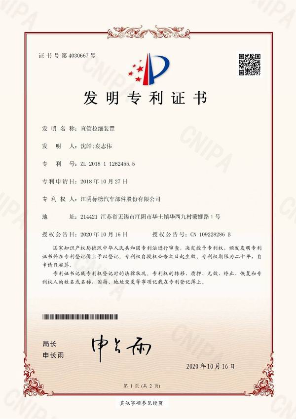 公司研發(fā)的“直管拉細(xì)裝置”喜獲國家發(fā)明專利。